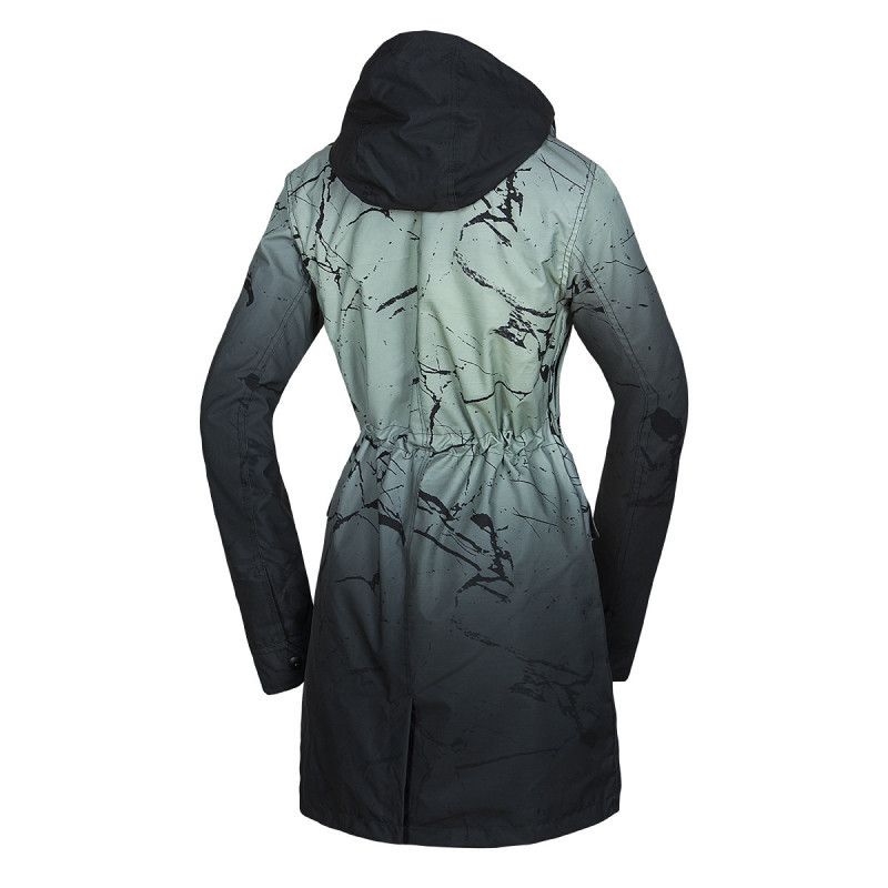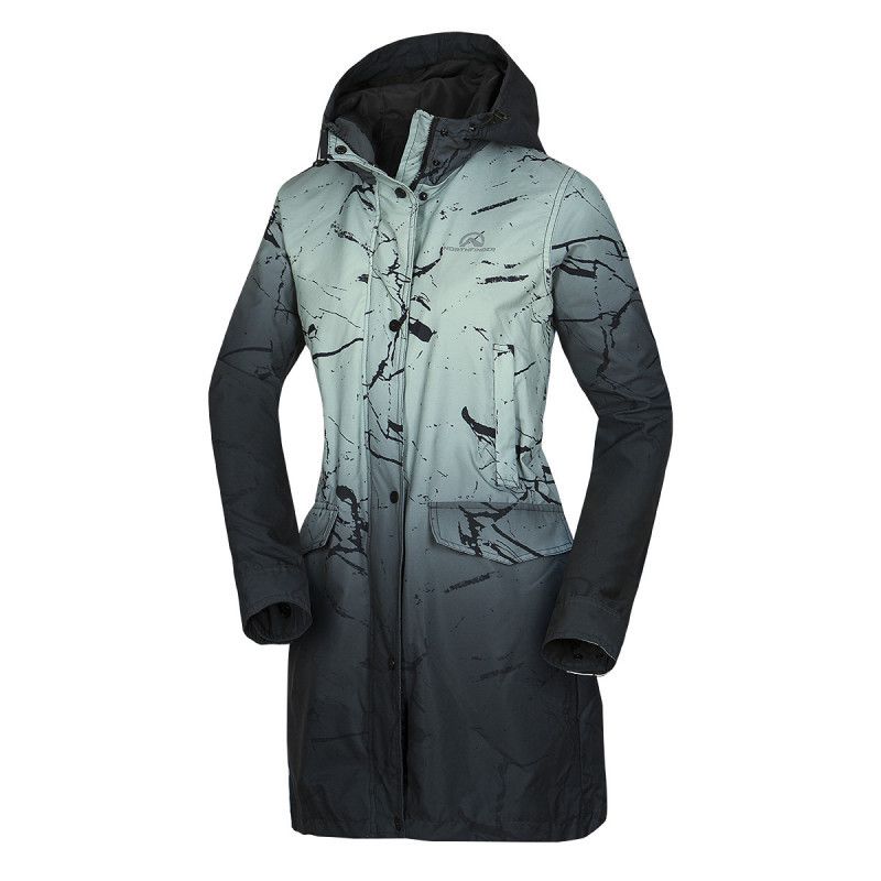 Northfinder Zora je ľahká dámska 2L bunda s výraznou celoplošnou potlačou, navrhnutá na voľnočasové nosenie od jari do jesene. Predĺžený športový strih pôsobí ako ľahký plášť – siaha približne do polovice stehien a poskytuje lepšie krytie v sychravom počasí.