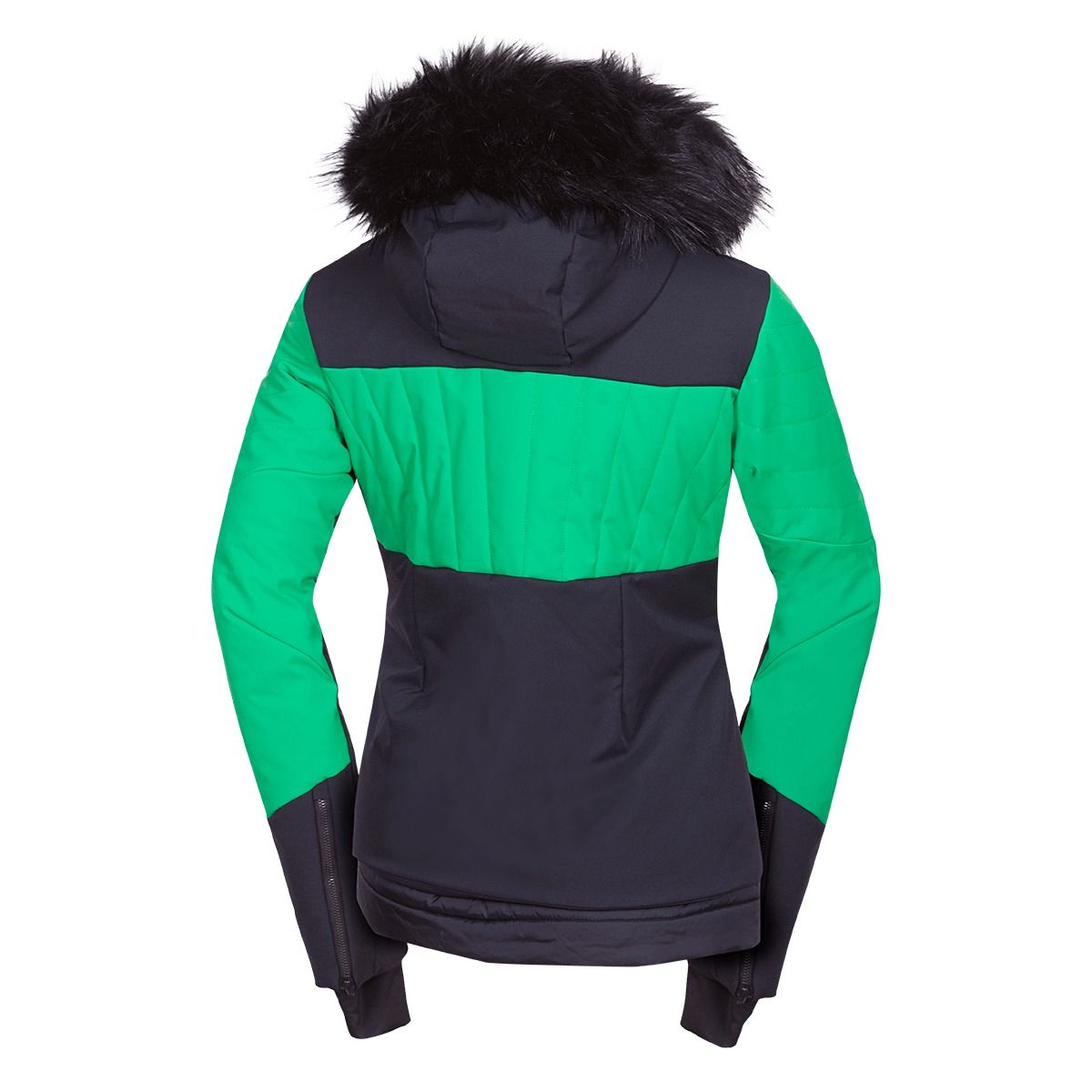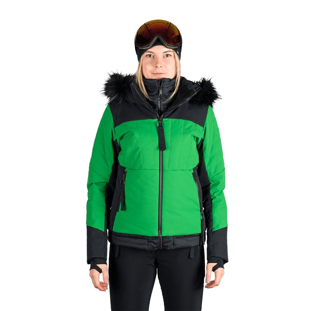 Bunda ponúka prakticky vyriešené detaily pre lyžiarky: dve priestranné bočné vrecká na zips, vrecko na skipas na rukáve, vnútorné vrecko na okuliare a ďalšie vnútorné vrecko na zips. Pevná 3D kapucňa s odnímateľnou kožušinou chráni pred vetrom a snehom a zároveň dotvára výrazný ženský vzhľad.